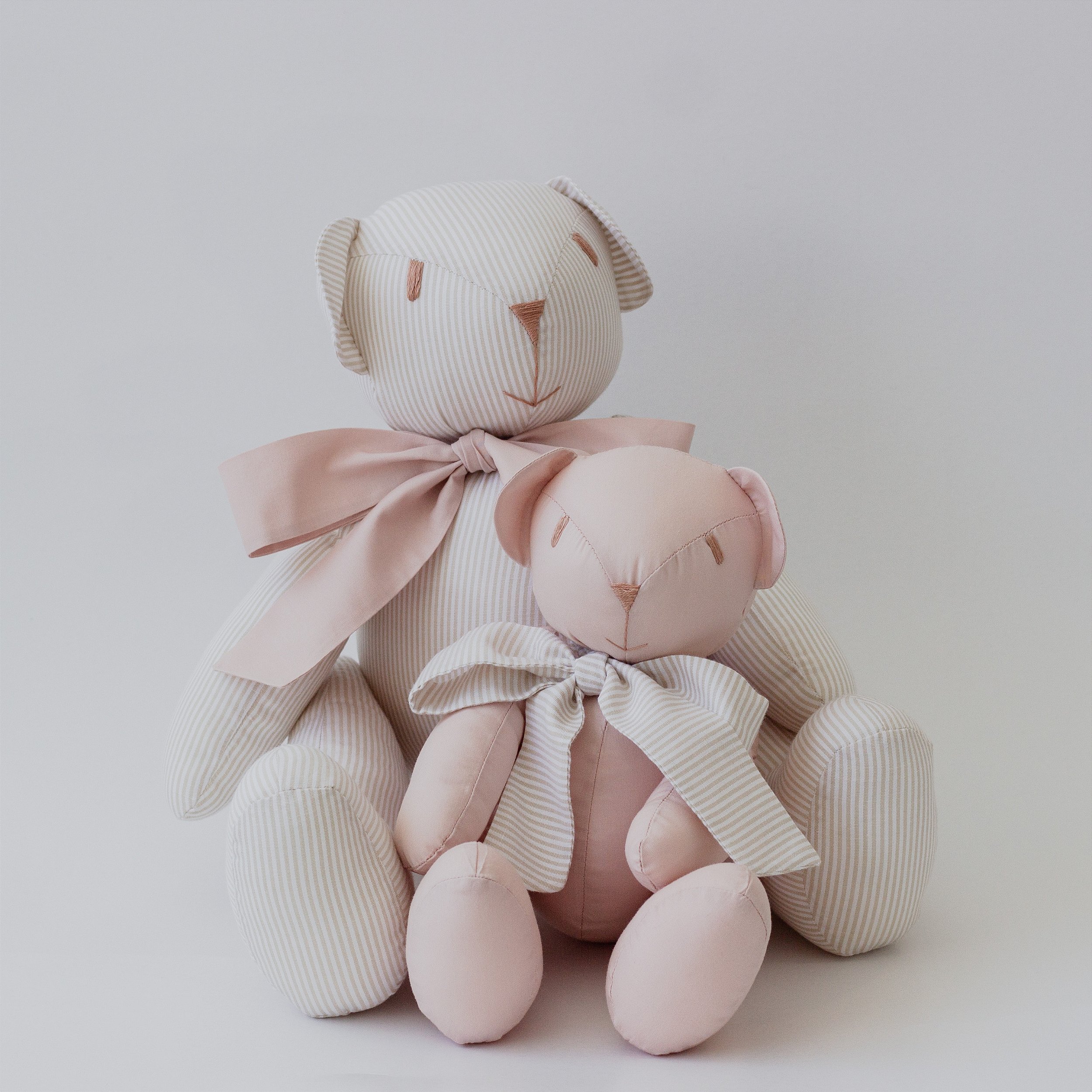 Uma dupla encantadora de ursinhos clássicos e neutros, perfeita para se adaptar a qualquer estilo de decoração. O conjunto é formado por um Urso G em tecido bege listrado com laço rosê liso e um Urso M em tecido rosê liso com laço listrado, criando um composê harmonioso e cheio de ternura.