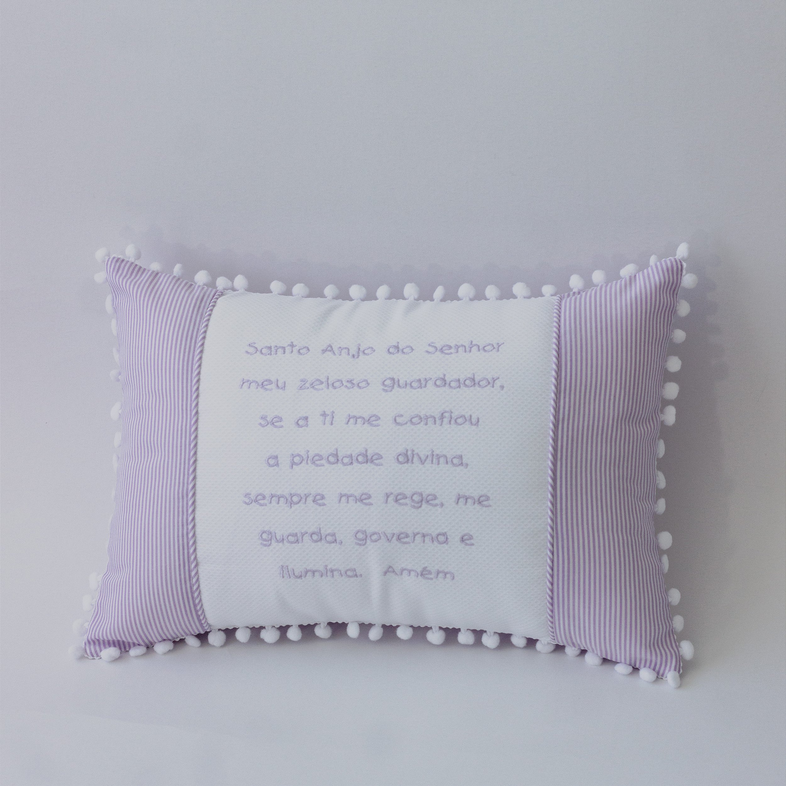 Confeccionada artesanalmente em tecido 100% algodão, possui acabamento delicado em pompom branco e a oração do Santo Anjo bordada, transmitindo proteção e amor em cada ponto.